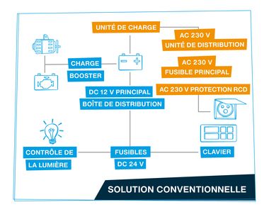 La configuration électrique d’un véhicule sur le marché du caravaning est extrêmement complexe : l’espace restreint nécessite des solutions compactes et intelligentes. L’intégration et le câblage ne doivent pas prendre trop de temps de production ni d’espace de construction.