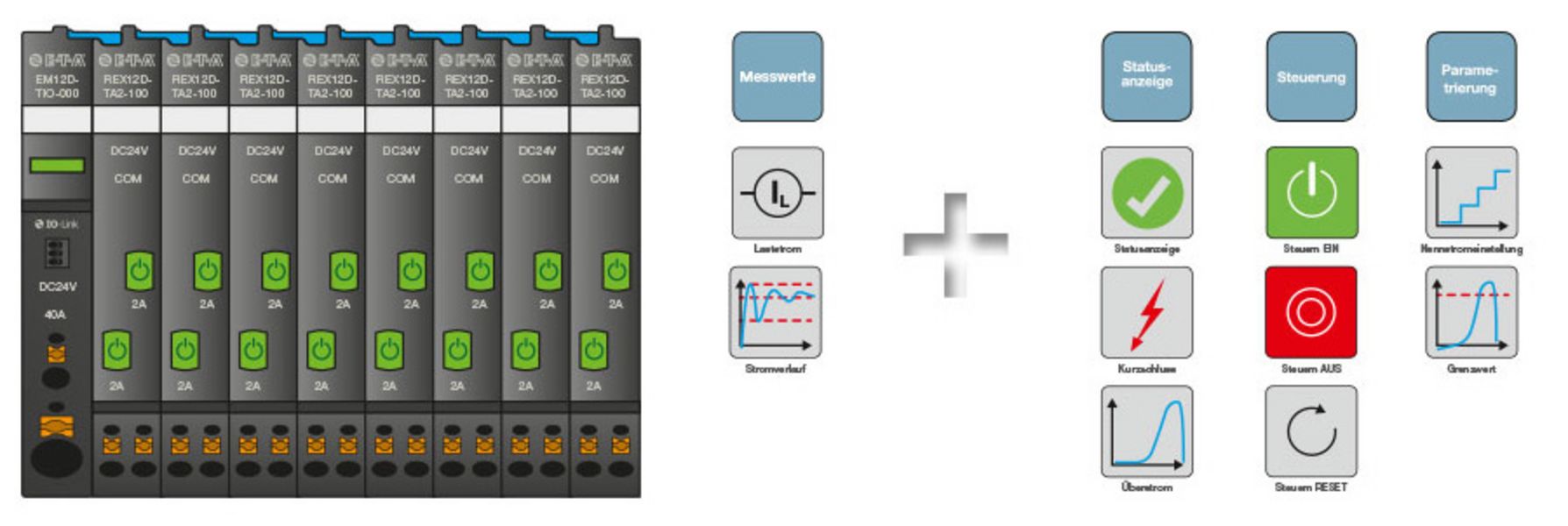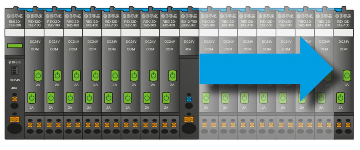 Le système intelligent du type REX12D est adapté idéalement aux exigences de la construction des machines et des équipements. Sa forme compacte, sa conception modulaire, sa technologie de raccordement innovante et son grand nombre de modules différents vous offrent un avantage certain par rapport aux solutions standards pour la protection de votre système de distribution de courant 24 V DC contre les surcharges en courant.